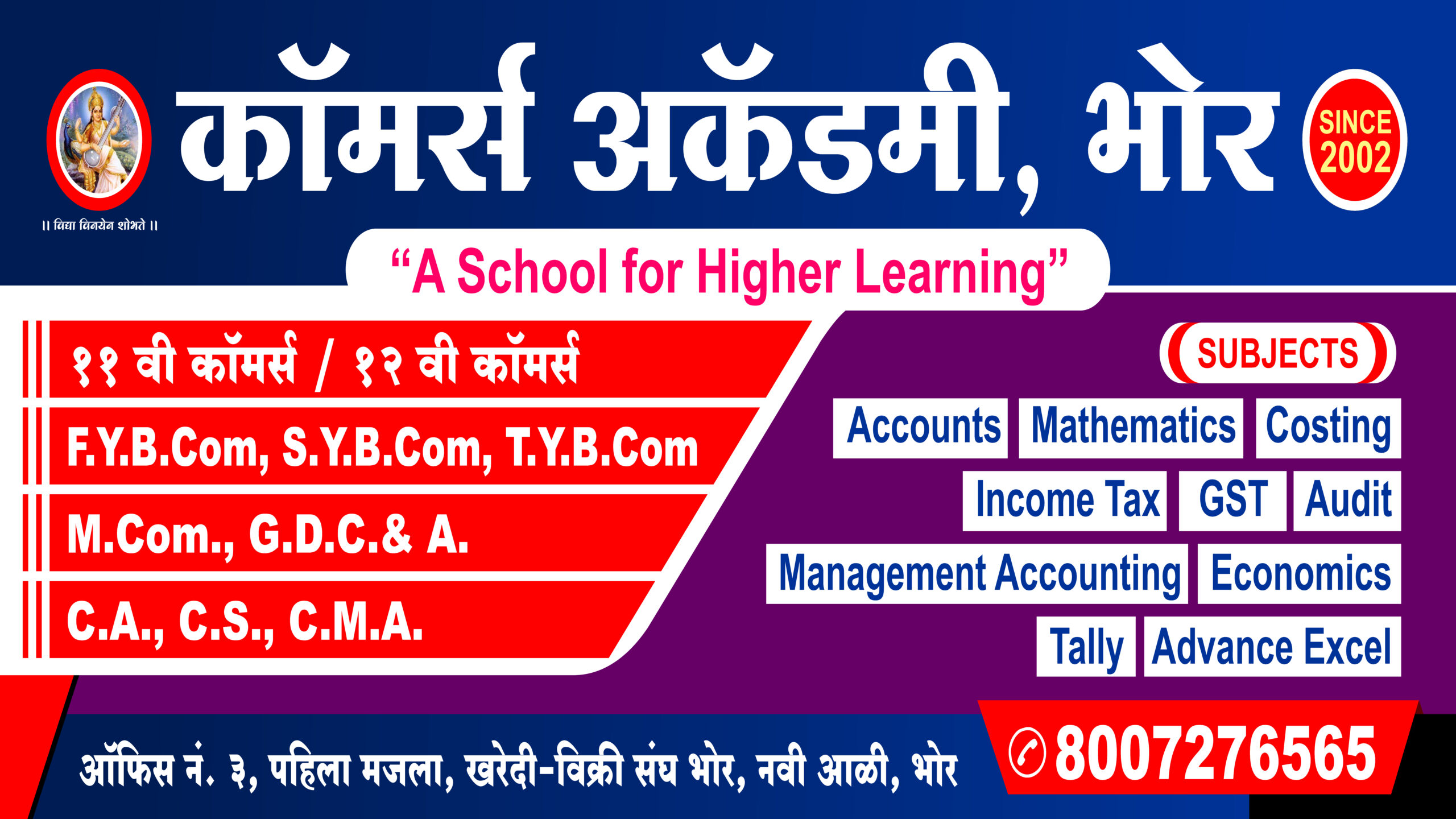 β All Commerce courses and Higher Education, Master MSCIT, Tally Prime with GST, Advanced Excel & English Speaking with 100% quality training.